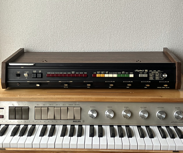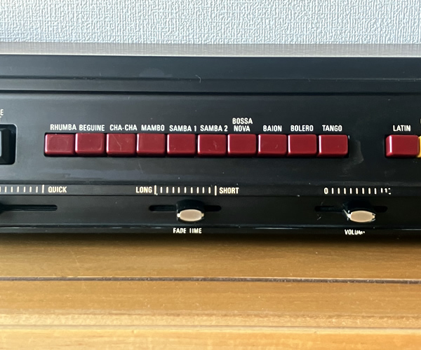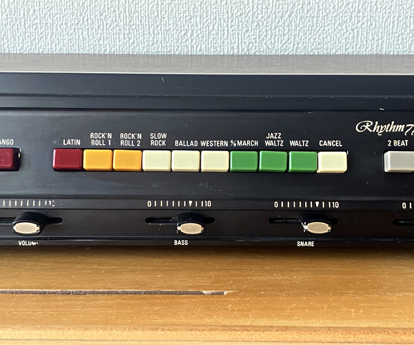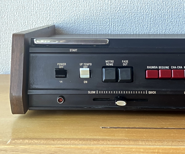 ローランド1972年発売のプリセットリズム付きビンテージ・リズムマシン。電子オルガンの上に置くのに最適なスマートな横形タイプです(本機は譜面台が取り外されています)。タッチ操作によるリズムスタート&ストップ、ワンタッチでリズムのテンポが2倍になるアップテンポスイッチ、エンディング効果の得られるフェイドアウトスイッチなど演奏時リアルタイムに使える便利機能を装備。6種類の打楽器音の音量調節ができるスライドコントロール。メトロノームスイッチ付。