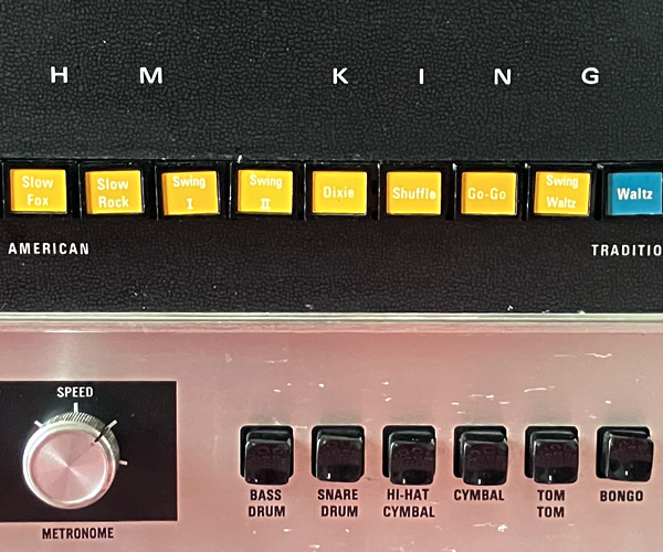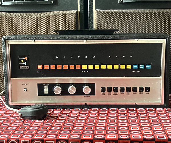Maestroのビンテージリズムマシン上位モデルRhythm King、いわゆるドンカマですね。イナタい音します。デザイン、サウンドともにビンテージ・コンボオルガンとの相性バッチリです。スライ・ストーン氏も愛用していたとか。