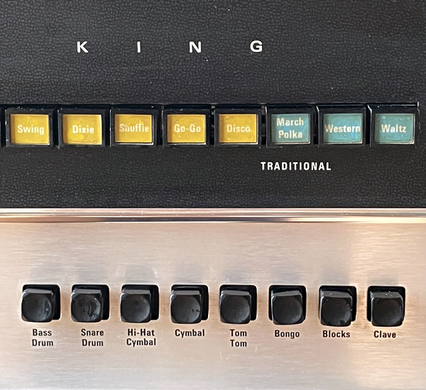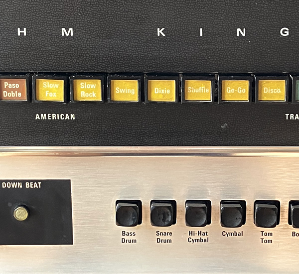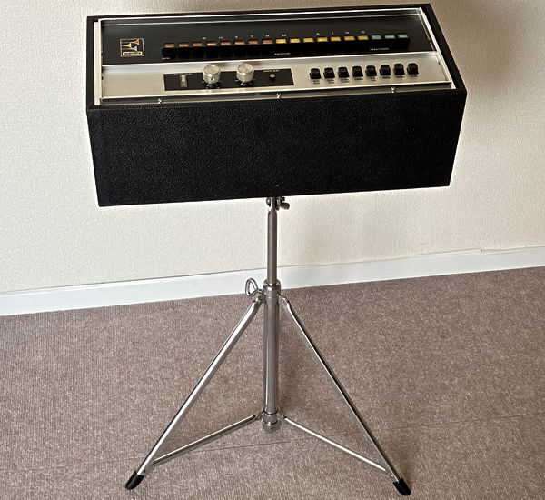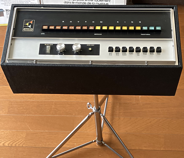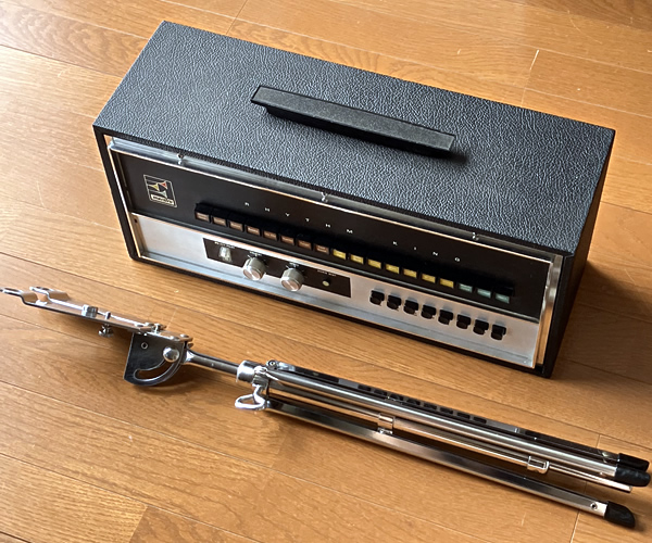Maestroのビンテージリズムマシン上位モデルRhythm King、いわゆるドンカマですね。イナタい音します。デザイン、サウンドともにビンテージ・コンボオルガンとの相性バッチリです。スライ・ストーン氏も愛用していたとか。レアなオリジナルスタンド付属。