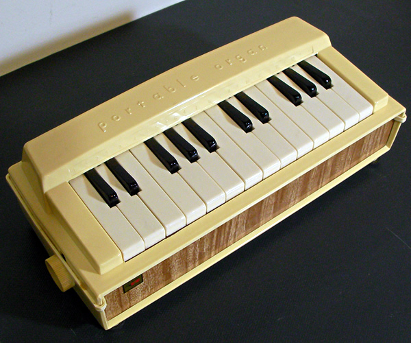 60〜70年代日本製ミニオルガン。内部に設置されたモーターで風を起こし鍵盤をプッシュすることで各音階のリードを鳴らす仕組み。足踏みオルガンやアコーディオンと基本的には同様の構造です。「ウィーン」というモーター回転音が若干うるさい気もしますが、それもまたノスタルジック。演奏用としてはもちろんオブジェやディスプレイとしてもオススメ!