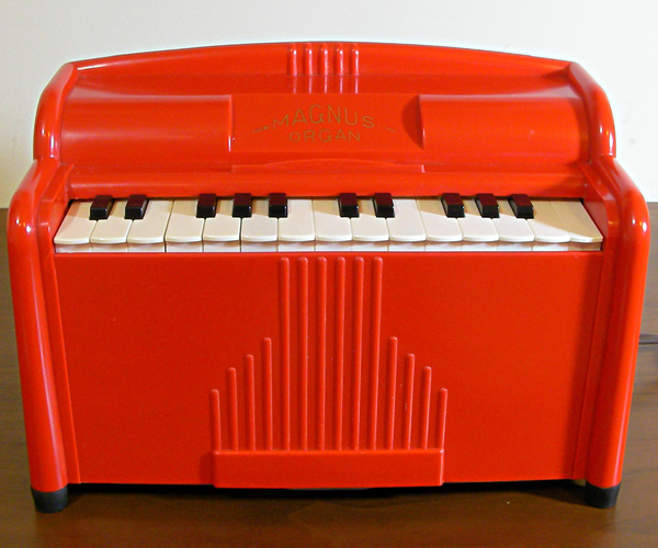 1950年代アメリカ製ミニオルガン(仕入れ先情報によると1940年代製とのことですが未確認)、レア赤バージョンです。内部に設置された電気タービンで風を起こし鍵盤をプッシュすることで各音階のリードを鳴らす仕組み。足踏みオルガンやアコーディオンと基本的には同様の構造です。優しく温かな音色が郷愁を誘います。初期バージョンのためタービン音は少し大きめです(動画参照)。