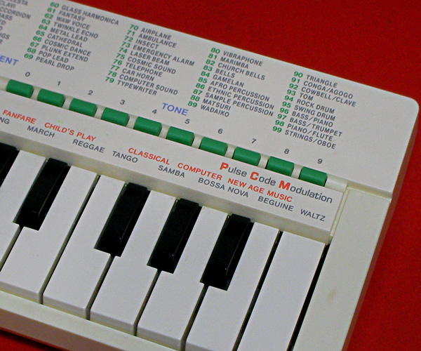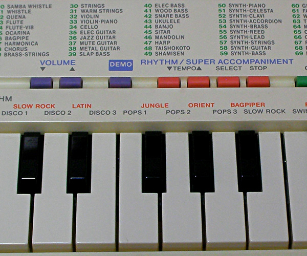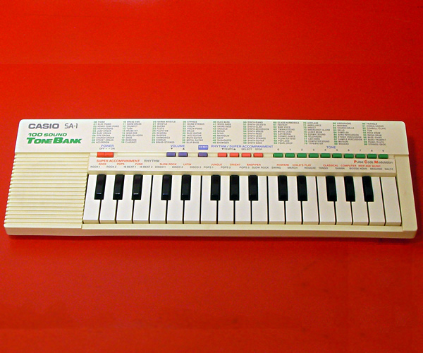 80年代カシオキーボードの逸品SA-1ホワイトバージョンです。ボタンの配色が絶妙ですね。その小さなボディに100音色、自動伴奏&リズムも内蔵!当時のカシオの技術を駆使して作り上げたCOOL JAPANなキーボードです。
