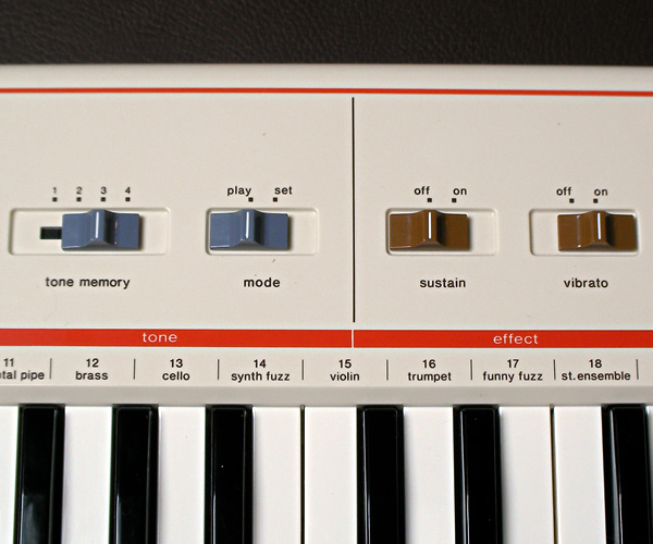・音色:22種(electric piano/banjo/guitar/harpsichord/xylophone/celesta/glockenspiel/organ/accordion/pipe organ/oriental pipe/brass/cello/synth fuzz/violin/trumpet/funny fuzz/st. ensemble/clarinet/flute/recorder/folk flute)