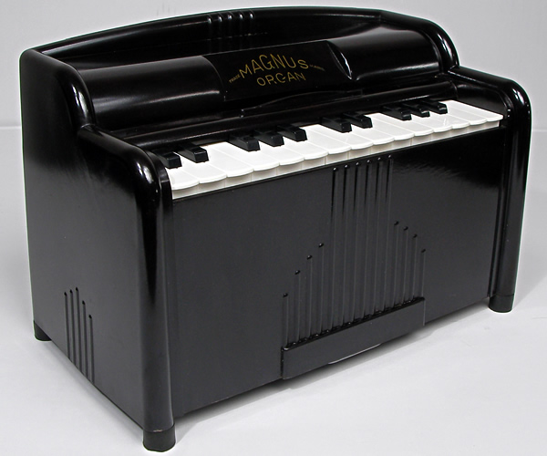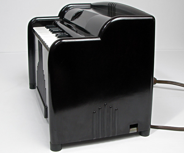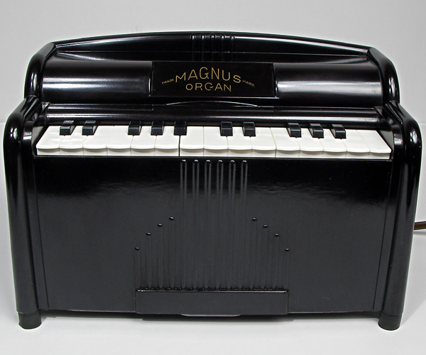 1950年代アメリカ製ミニオルガン。内部に設置された電気タービンで風を起こし鍵盤をプッシュすることで各音階のリードを鳴らす仕組み。足踏みオルガンやアコーディオンと基本的には同様の構造です。優しく温かな音色が郷愁を誘います。アメリカンビンテージなルックスも素敵ですね。初期バージョンのためタービン音は少し大きめです(動画参照)。実演奏用というよりもインテリアなどにいかがでしょうか。