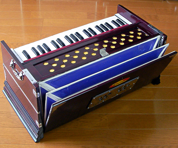 背面のふいごで空気を送ってリードを鳴らす方式のハルモニウム。19世紀半ばに移動可能オルガンとしてフランスで発明され、インド音楽演奏に合うよう独自の発展を遂げたものとされています。本機は最もポピュラーなスタンダードタイプ。