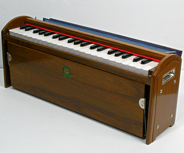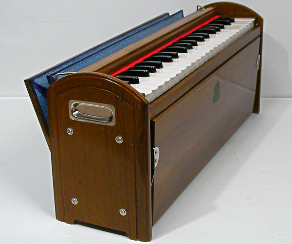 背面のふいごで空気を送ってリードを鳴らす方式のハルモニウム。19世紀半ばに移動可能オルガンとしてフランスで発明され、インド音楽演奏に合うよう独自の発展を遂げたものとされています。本品は、そのインド産ハルモニウム発祥の地であり高い技術力を持つ工房が多い都市コルカタにあるMONOJ KUMAR SARDAR & BROS.工房の作品…持ち運びに便利な小型軽量の携帯用ハルモニウムです。インド音楽に精通している日本人ミュージシャンセレクトによる現地買付品。