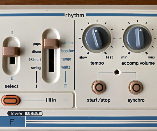 ・rhythmセレクトスイッチ(8種[4×2]):pops/samba, disco/beguine, 16 beat/tango, swing/waltz
