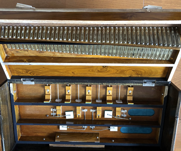 1鍵にオクターブ2リード、空気量調整ストップ4(基準音リード用×2&上オクターブリード用×2)、ドローンストップ5(G#,A#,C#,D#,F)など合計9つのストップを装備しています。今回、鍵盤アクションを小さく(浅く)する、また