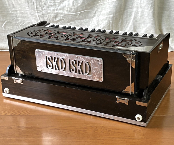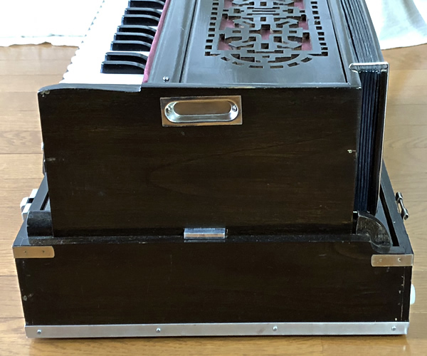 背面のふいごで空気を送ってリードを鳴らす方式のハルモニウム。19世紀半ばに移動可能オルガンとしてフランスで発明され、インド音楽演奏に合うよう独自の発展を遂げたものとされています。本機は3オクターブ半(42鍵)のスタンダードなハルモニウム…弾く時は上蓋を開け本体を引っ張り出して両サイドの金具でロック。持ち運ぶ時はロック解除してトランクケースのように収納、可搬性に優れたハルモニウムです。