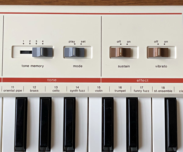 ・音色:22種(electric piano/banjo/guitar/harpsichord/xylophone/celesta/glockenspiel/organ/accordion/pipe organ/oriental pipe/brass/cello/synth fuzz/violin/trumpet/funny fuzz/st. ensemble/clarinet/flute/recorder/folk flute)