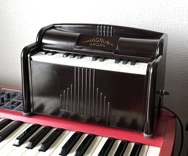 1950年代アメリカ製ミニオルガン。内部に設置された電気タービンで風を起こし鍵盤をプッシュすることで各音階のリードを鳴らす仕組み。足踏みオルガンやアコーディオンと基本的には同様の構造です。優しく温かな音色が郷愁を誘います。アメリカンビンテージなベークライトボディも素敵ですね。土台となる底面はレアな木製でしっかりとした作りとなっております。タービン音は少し大きめです(動画参照)。