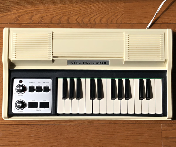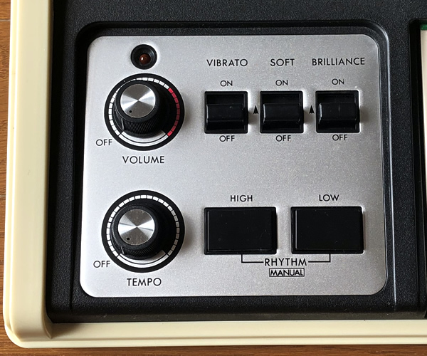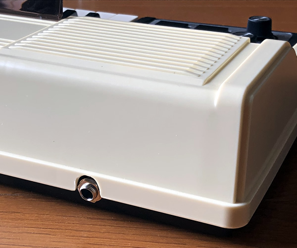 日本製ビンテージトイオルガン。おもちゃ楽器だけにチューニングはジャストではありませんが英語表記のコントロールパネル、アイボリーボディなどクールなルックスです。すぐにお使いいただけるようにアウトプットをミニから標準へとモディファイしました。