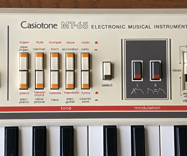 80年代ビンテージ・カシオトーンMT-65です。人気の高いスレンテンMT-40ほどではないですが、フロントパネルのデザイン、アナログシンセ的なモジュレーションボタン、4種のエフェクト、多彩な自動伴奏機能…、個人的には隠れた名機だと思います。