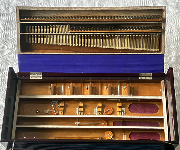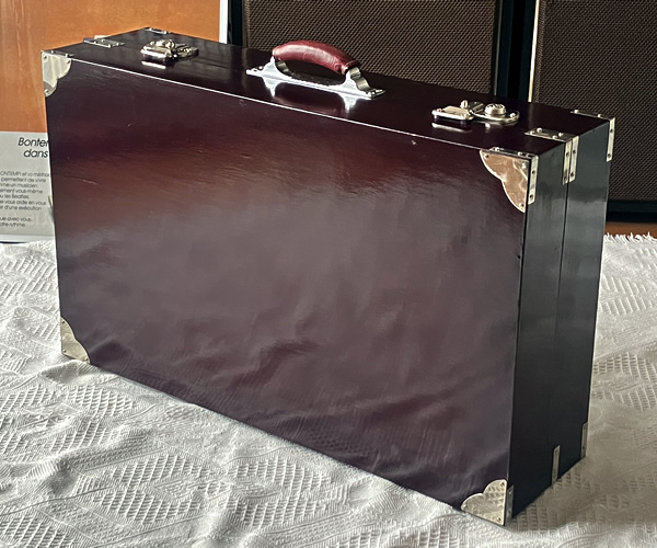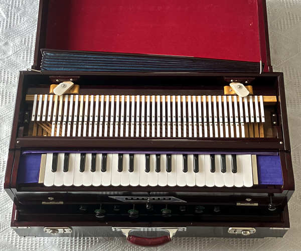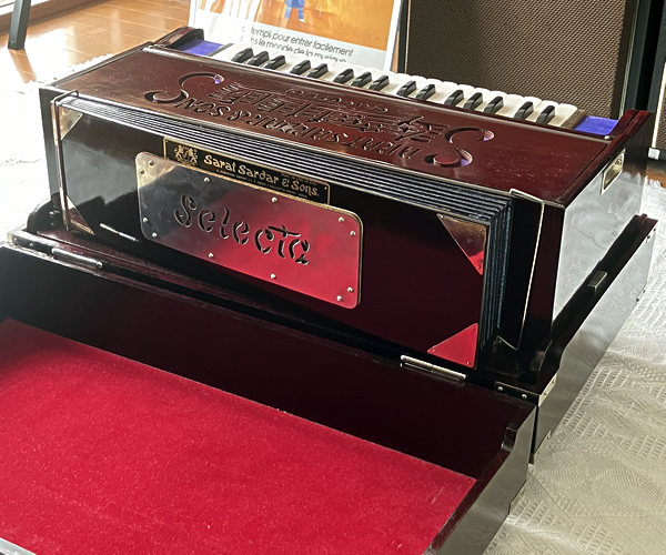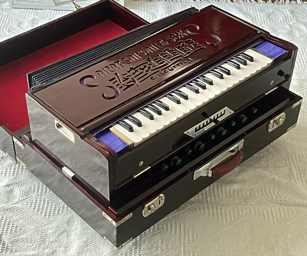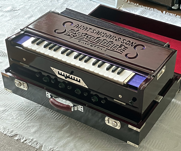 背面のふいごで空気を送ってリードを鳴らす方式のハルモニウム。19世紀半ばに移動可能オルガンとしてフランスで発明され、インド音楽演奏に合うよう独自の発展を遂げたものとされています。本機は弾く時は上蓋を開け(上蓋は取り外せません)本体を引っ張り出して両サイドの金具でロック、持ち運ぶ時はロック解除してトランクケースのように収納、可搬性に優れたハルモニウムです。さらに同運指で移調できる9段階のスケールチェンジャー及びオクターブ下を同時に操作できるカプラーストップ付きのハイスペックなハルモニウムです。