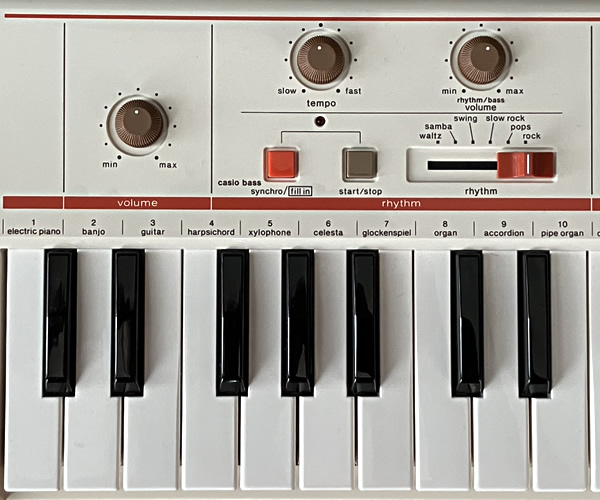 Casiotoneの名器MT-40…デジタルレゲエのリズム、スレンテンは、このMT-40から生まれました。クールなベースシンクロ機能、感覚的に操作できるリズムフィルインなど本機1台でバックトラックの制作も可能です。カシオプラスチックケース付属。