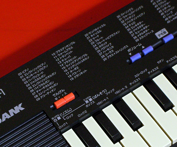 ・音色:100種(PIANO/ELEC PIANO/HONKEY-TONK PIANO/HARPSICHORD/JAZZ ORGAN/ELEC ORGAN/PIPE ORGAN/CHURCH ORGAN/STREET ORGAN/ACCRORDION/BRASS ENS/WARM BRASS/TRUMPET/TUBA/BRASS HIT/WIND ENS/ENGLISH HORN/OBOE/BASSOON/CLARINET/SAMBA WHISTLE/WHISTLE/QUENA/FLUTE/FLUTE-VIB/OCARINA/BAGPIPE/HARMONICA/CHORUS/BRASS-STRINGS/STRINGS/WARM STRINGS/VIOLIN/VIOLIN-PIANO/CELLO/ELEC GUITAR/JAZZ GUITAR/MUTE GUITAR/METAL GUITAR/SLAP BASS/ELEC BASS/WOOD BASS/SNARE BASS/UKULELE/BANJO/SITAR/MANDOLIN/HARP/TAISHOKOTO/SHAMISEN/SYINTH-PIANO/STNTH-CELESTA/SYNTH-CLAVI/SYNTH-ACCORDION/SYNTH-BRASS/SYNTH-REED/SYNTH-LEAD/SYNTH-STRINGS/SYNTH-GUITAR/SYNTH-BASS/GLASS HARMONICA/FANTACY/WAW VOICE/TWINKLE ECHO/METAL LEAD/CATHEDRAL/COSMIC DANCE/PLUNK EXTEND/POPLEAD/PEARL DROP/AIRPLANE/AMBULANCE/INSECT/EMERGENCY ALARM/LASER BEAM/COSMIC SOUND/TELEPHONE/CAR HORN/COMPUTER SOUND/TYPEWRITER/VIBRAPHONE/MARIMBA/CHURCH BELLS/BELLS/GAMELAN/AFRO PERCUSSION/SAMPLE PERCUSSION/MATSURI/WADAIKO/TRIANGLE/CONGA+AGOGO/COWBELL+CLAVE/TOM/ROCK DRUM/SWING DRUM/BRASS+PIANO/BRASS+TRUMPET/PIANO+FLUTE/STRINGS+OBOE)