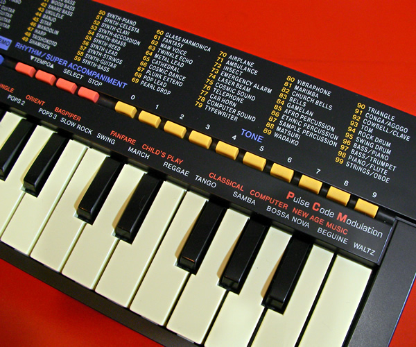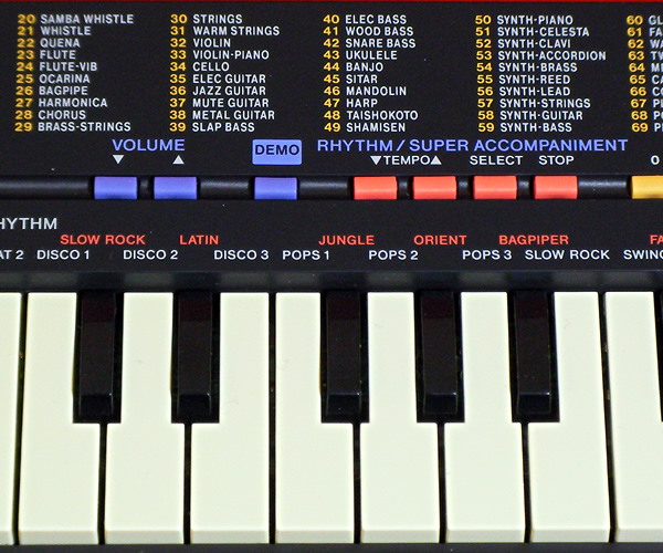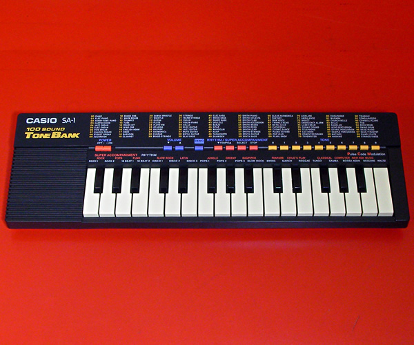 80年代カシオキーボードの逸品SA-1です。鍵盤が付いたものとしてはカシオ最小ではないでしょうか(未確認です)。その小さなボディに100音色、自動伴奏&リズムも内蔵!当時のカシオの技術を駆使して作り上げたCOOL JAPANなキーボードです。