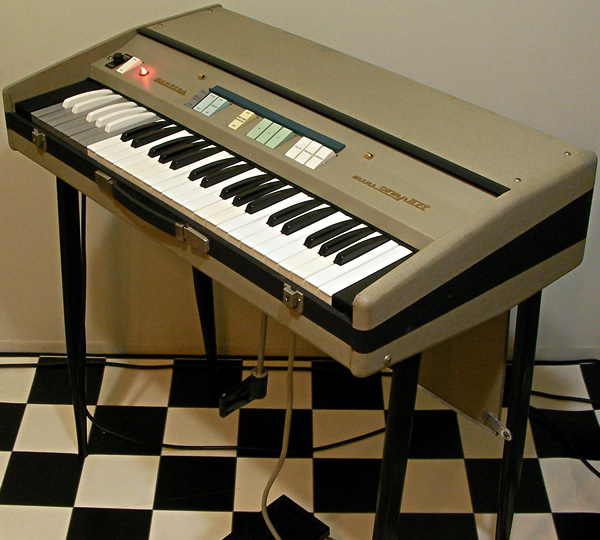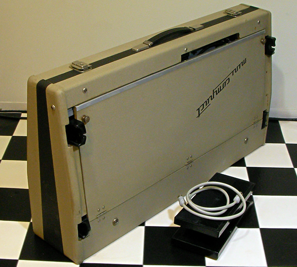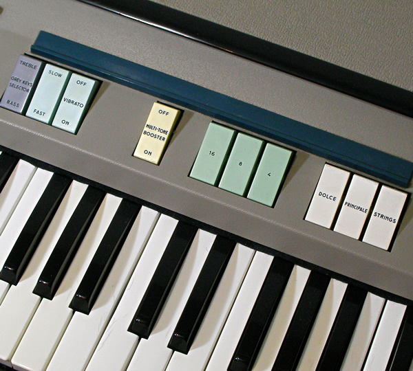 Kneeレバーがユニーク。グリーンがかったアイボリー色ボディがヨーロッパな雰囲気で上品ですね。独特な音色は他の同時代コンボオルガンとは一線を画しています。
