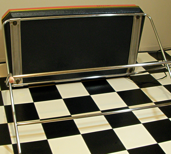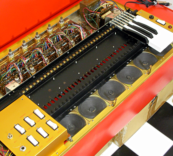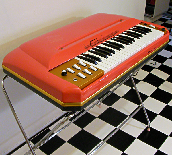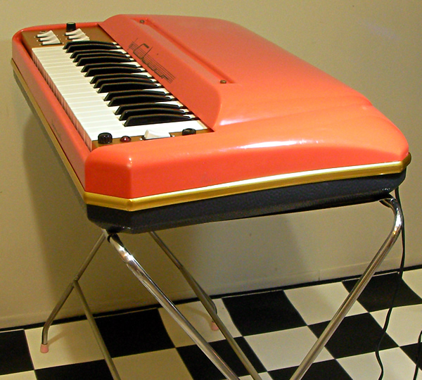 ベネズエラの広告に掲載されていることから中央アメリカ周辺で販売されていたと推測できます。中域から高域3オクターブ鍵盤のコンパクトボディですが、特筆すべきは内蔵6連スピーカー!本体のみでもかなりな大音量で演奏できます。まるでリアに爆音ウーファーを積んだ改造車(!)ボディデザインもさすがイタリアン、フェラーリのような後ろ姿にうっとりです。国内外の市場にもほとんど出てこない超レアな一台、オススメです。ボディ、トップカバー共にプラスチック製。