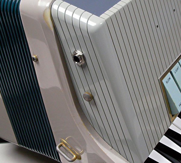 Farfisaのビンテージ電子アコーディオンTransicordです。形状はアコーディオンですが内部構造はFarfisa Compactオルガンとほぼ同じ。アコーディオン型コンボオルガンと言ったほうが近いかもしれません。CompactオルガンのKneeレバー機能を蛇腹で実現しています。音を出すには電源供給を兼ねた専用アンプが必要なのですが、本品は未付属のため本機のみで演奏可能なようにカスタマイズ(ACアダプター電源, 標準アウトプット装備)しました。アコーディオンプレイヤーの方には奏法そのままにビンテージコンボオルガンサウンドを提供、また平置きにすれば41鍵コンパクトサイズのファルフィッサオルガンとしてご利用できます。標準アウトを装備したことでエフェクターなど出音の加工も簡単ですね。