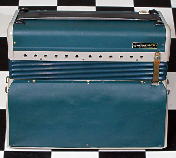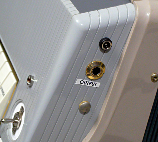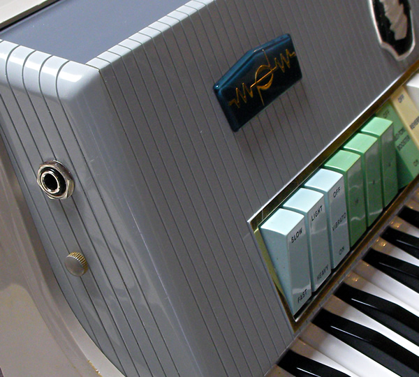 Farfisaのビンテージ電子アコーディオンTransicordです。形状はアコーディオンですが内部構造はFarfisa Compactオルガンとほぼ同じ。アコーディオン型コンボオルガンと言ったほうが近いかもしれません。CompactオルガンのKneeレバー機能を蛇腹で実現しています。本来、音を出すには電源供給を兼ねた専用アンプが必要なのですが、本品は未付属のため本機のみで演奏可能なようにカスタマイズ(ACアダプター電源, 標準アウトプット装備)しました。アコーディオンプレイヤーの方には奏法そのままにビンテージコンボオルガンサウンドを提供、また平置きにすれば41鍵コンパクトサイズのファルフィッサオルガンとしてご利用できます。標準アウトを装備したことでエフェクターなど出音の加工も簡単ですね。