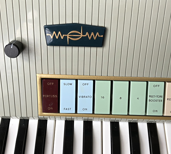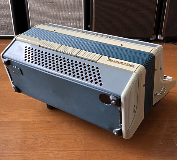 Farfisa Compactオルガンとほぼ同等の内部構造持つビンテージ電気アコーディオンTransicord…ベース&コードボタンに欠品があったので全て取り外し電気アコーディオンから電気オルガンへコンバートカスタマイズ。フロントにボリュームノブ、右サイドにACアダプタージャック、アウトプット&エクスプレッションペダル・ジャックを設置。41鍵コンパクトサイズのファルフィッサオルガンですね。ベース&コードボタン部にすき間ができたので半透明アクリルで塞ぎ中から電球色LEDを発光させました(フェイク真空管)。蛇腹は固定で開きません。