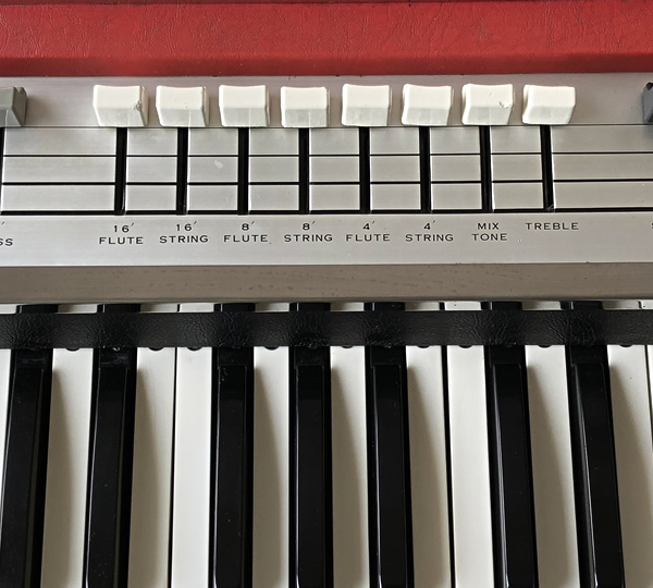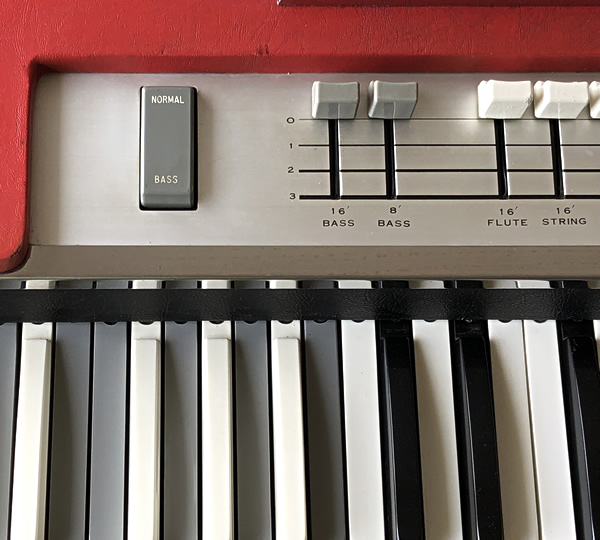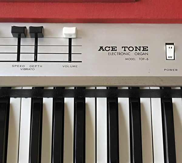 音色はFLUTEとSTRINGの2音色のバリエーション(16'/8'/4'/MIX)、ドローバーライクに操作可能なスライダーなど、Ace Tone TOPシリーズの中でも最もオルガンらしさを追求したモデルTOP-6です。特筆すべきは16'と8'の2オクターブ音色を持つベース鍵盤設定時のベース部(グレー反転)。VOXやFarfisaが採用している低音優先モノフォニックではなく和音可能なポリフォニックのためレガートで演奏しても音が途切れることはありません。さらに16'と8'をミックスした極太ベースサウンドも可能(※)。ベース部だけでも価値ありです。セカンドカーならぬセカンドコンボとしていかがでしょうか。