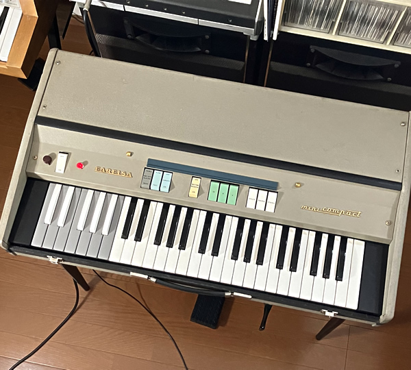 1966年〜68年頃に販売されていたイタリア製コンボオルガン。Farfisa Mini Compactの2ndバージョンで(正式名称Mini Deluxe Compact)、音をブーストできるKneeレバーがユニーク。グリーンがかったアイボリー色ボディがヨーロッパな雰囲気で上品ですね。独特な音色は他の同時代コンボオルガンとは一線を画しています。専用エクスプレッションペダルは付属しませんが、ローランド系ペダル(Roland EV-5など)への接続を可能にする