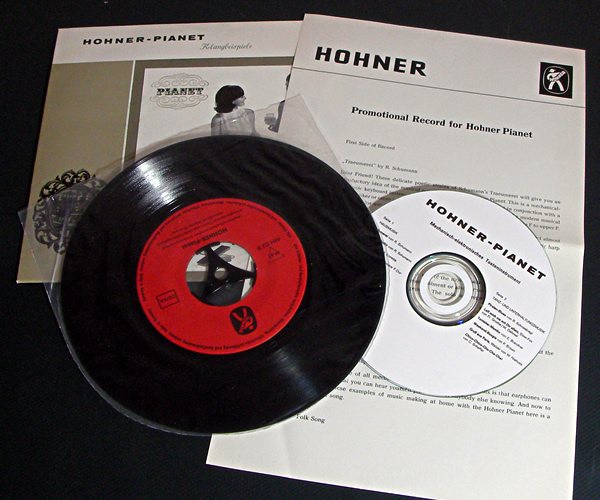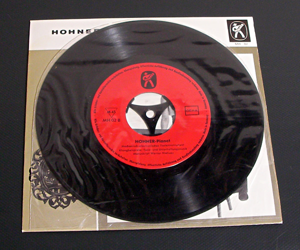Hohner社のエレクトリックピアノPianetプロモーション用レコードです。ドイツ語の解説と様々なスタイルのデモ演奏が収録されてます。イージーリスニングな雰囲気のピアネット演奏はサンプリングしてループで使うと面白いかも。A面はクラシック曲中心、B面はバンドをバックにジャズ、ブギウギ、マンボ、チャチャなどラウンジな内容となってます。レコードの音をデジタル収録したCDを付属。