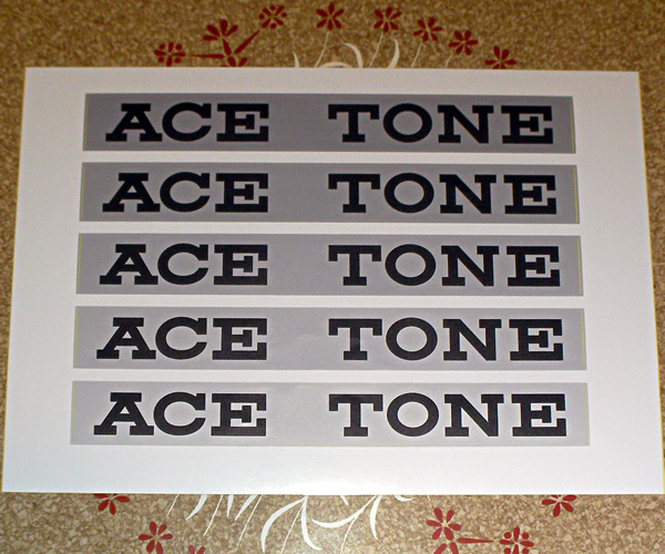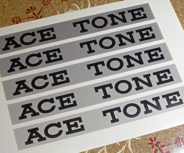 Ace Toneロゴシール・レプリカです。TOP-5オルガンなどのロゴプレートをコピーしました。下地グレー5パターン1シート(A4サイズ)販売です。破れにくく、しっかりとした素材の塩ビを使用。カットパス付き。