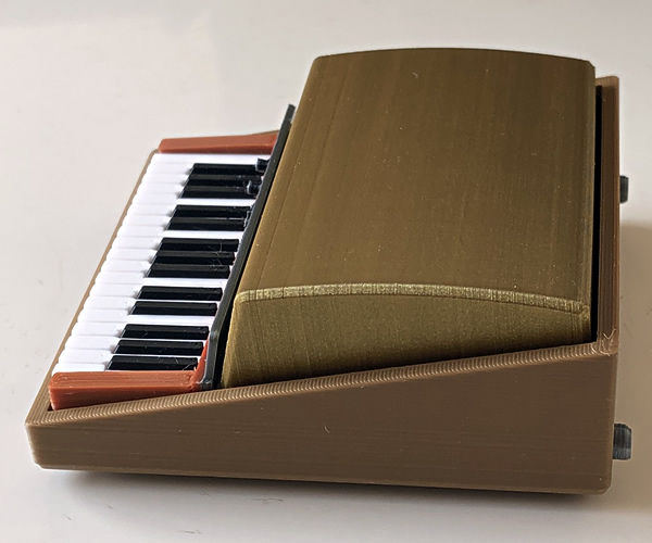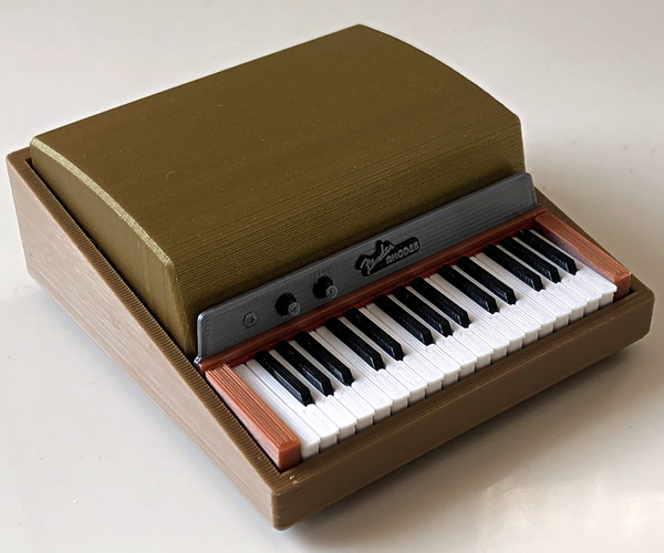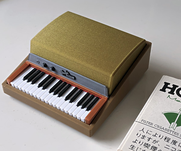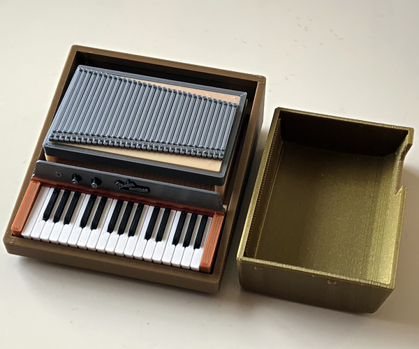 ミニチュアビンテージ鍵盤の第二弾、ゴールドトップのフェンダーローズ・ピアノベースです。3Dプリンタにより内部のトーンバー設置部までも再現された1/7.5サイズのミニチュア。ゴールドトップは取り外し可能。またトーンバープレートもオープンできます。プラスチック製。同じく