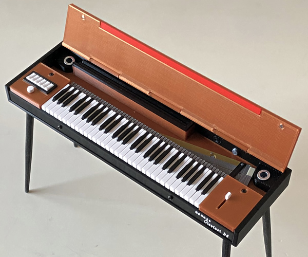 ミニチュアビンテージ鍵盤の第5弾、ホーナー・クラヴィネットD6…スタンド取り外し可、ミュートレバーも動きます。3Dプリンタにより内部にセットされた弦の様子も再現された1/7.5サイズのミニチュア。プラスチック製。ネジ設置式スタンドは取り外してお送りします(