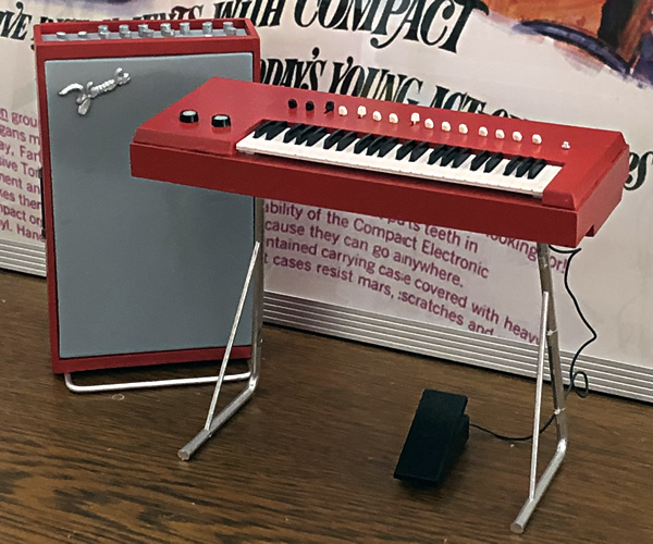 ミニチュアビンテージ鍵盤、第7弾はヤマハコンボオルガン第一号と言われているA-3です。こちらは3Dプリントではなく日本のメーカー、ニチモが1967年に発売した1/8プラスチック模型「ミュージックシリーズ」を組立&ペイントしたもの。付属アンプはヤマハ初のギターアンプNo.500を模してハンドメイドで作られたため縮尺はオルガンと同じではありません。3Dプリンタと違い精密コピーではないですがトーンレバーとペダルもちゃんと動きますよ^^